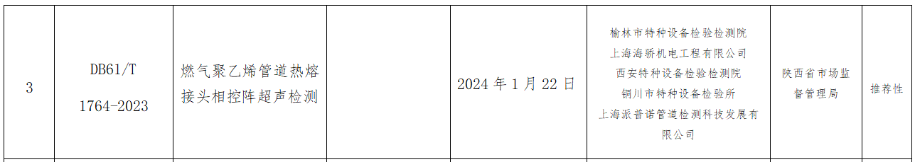 由榆林市特种设备检验检测院主导编制的《燃气聚乙烯管道电熔接头相控阵超声检测》(DB61/T 1763-2023)、《燃气聚乙烯管道热熔接头相控阵超声检测》(DB61/T 1764-2023)两项地方标准,经陕西省市场监督管理局批准,并于2023年12月22日发布、2024年1月22日起实施。
