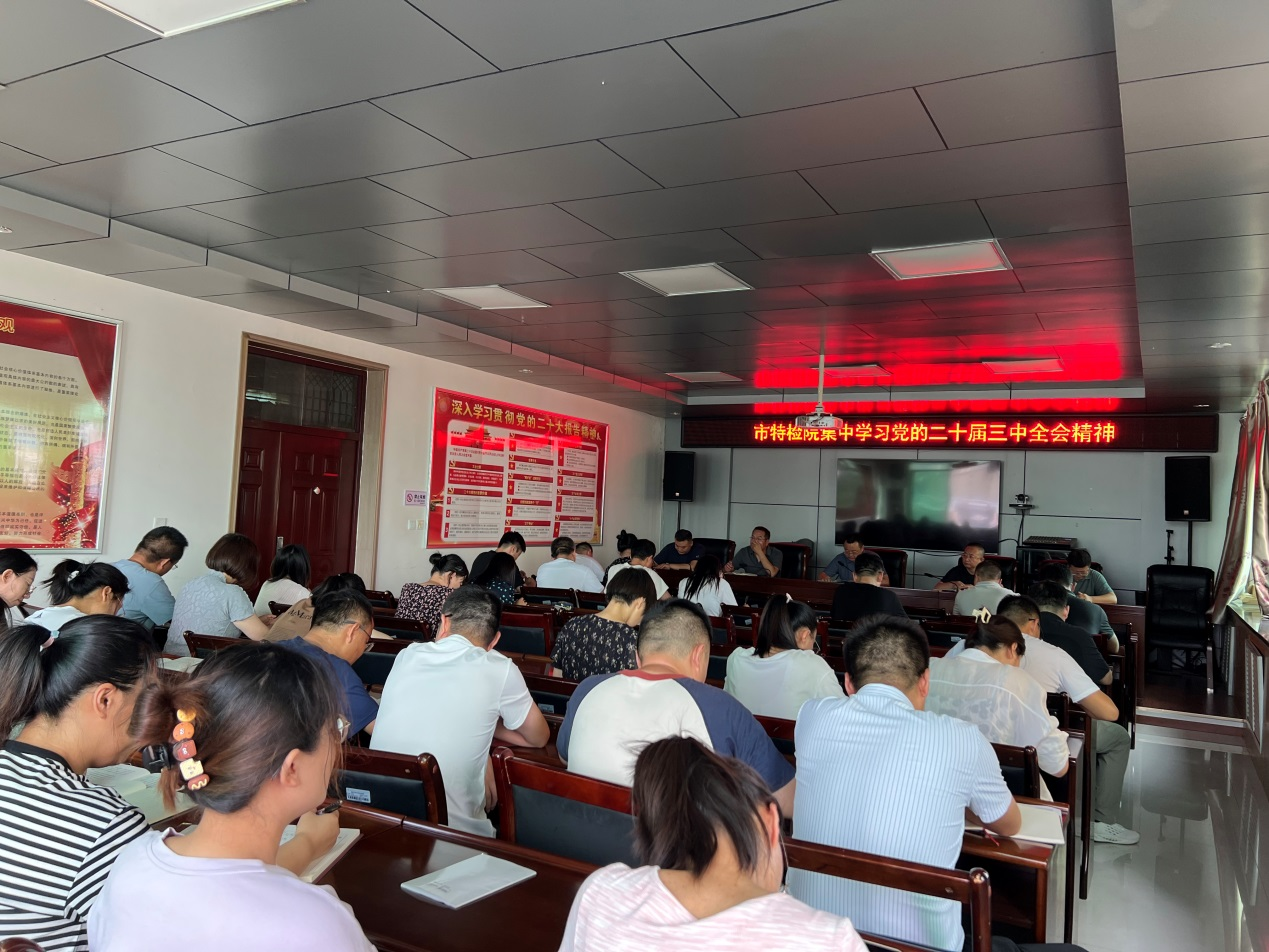 7月22日上午,市特检院召开党员干部大会,组织学习党的二十届三中全会精神。党支部书记、院长王占荣主持并讲话,全体在家党员干部参加了会议。